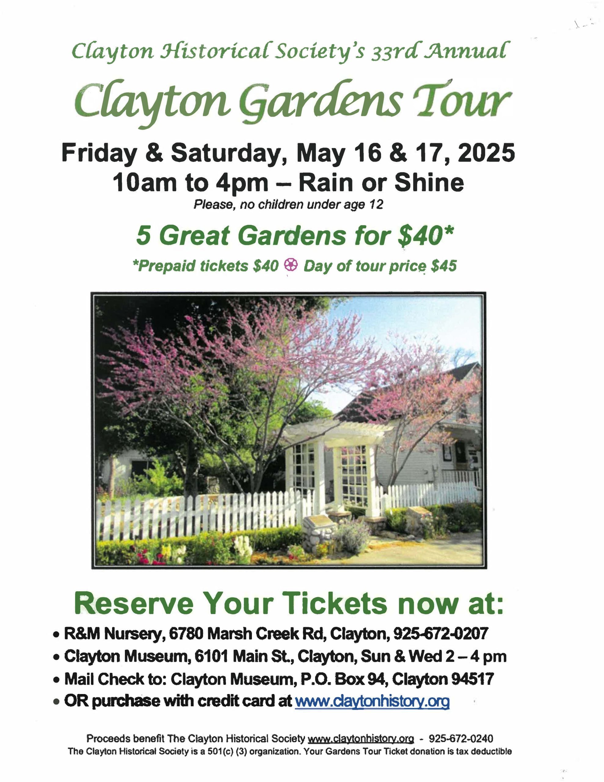 The Clayton Historical Society is a 501 (C) (3) organization. Your Gardens Tour Ticket is tax deductible