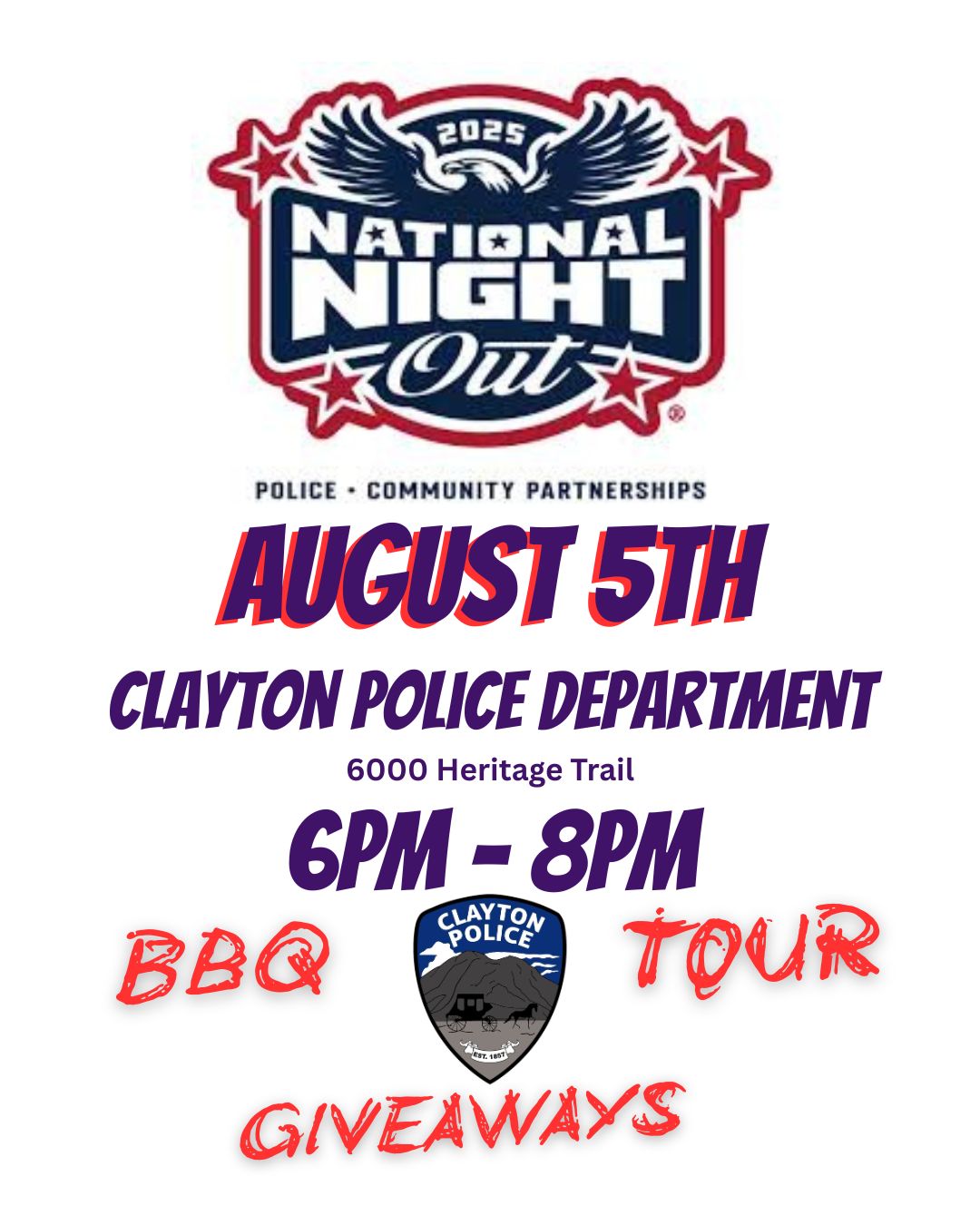 National Night Out! Come join us for our annual National Night Out Event! Tuesday, August 5th from 6pm – 8pm! Hosted by the Clayton Police Department and the City of Clayton. Come interact with our staff and see all the awesome services we provide! The event includes the following: